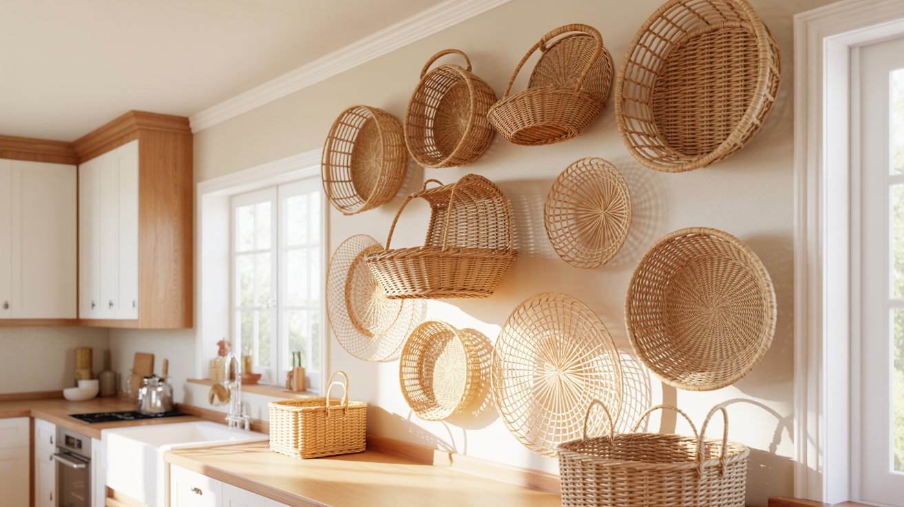 Wall basket decor brings warmth through texture and natural materials. The kitchen feels more welcoming.